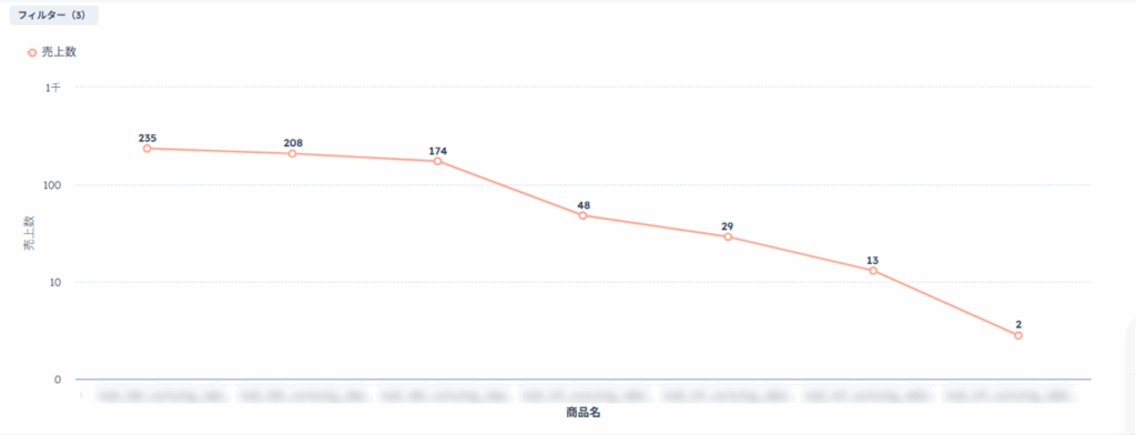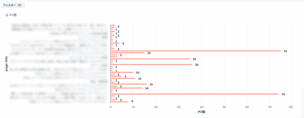 以下のような横棒グラフを活用して、ページタイトル別のPV数や商品別の売上一覧など、多くの項目を並列に比較する際に活用することができます。